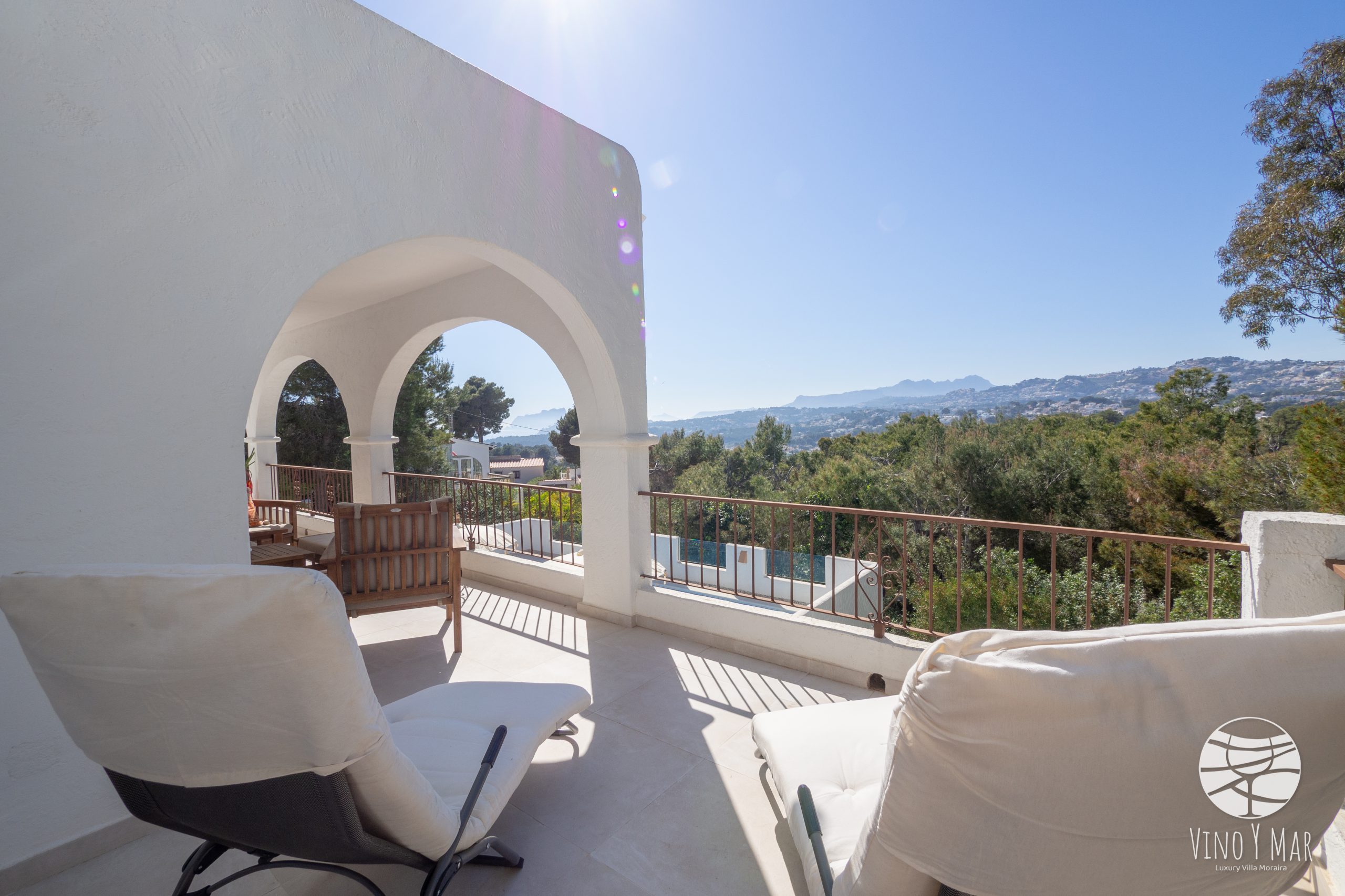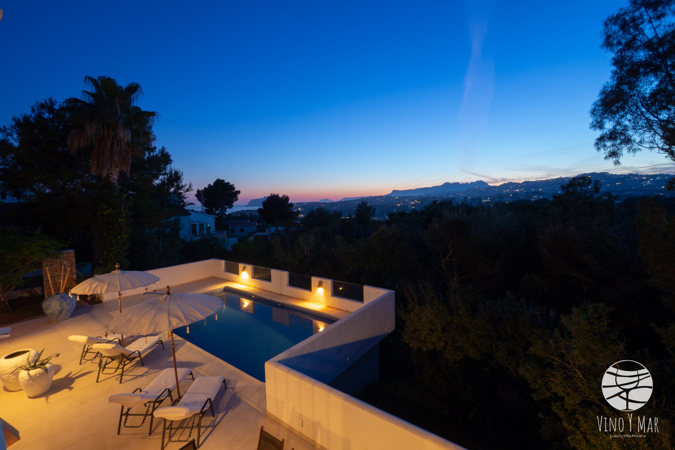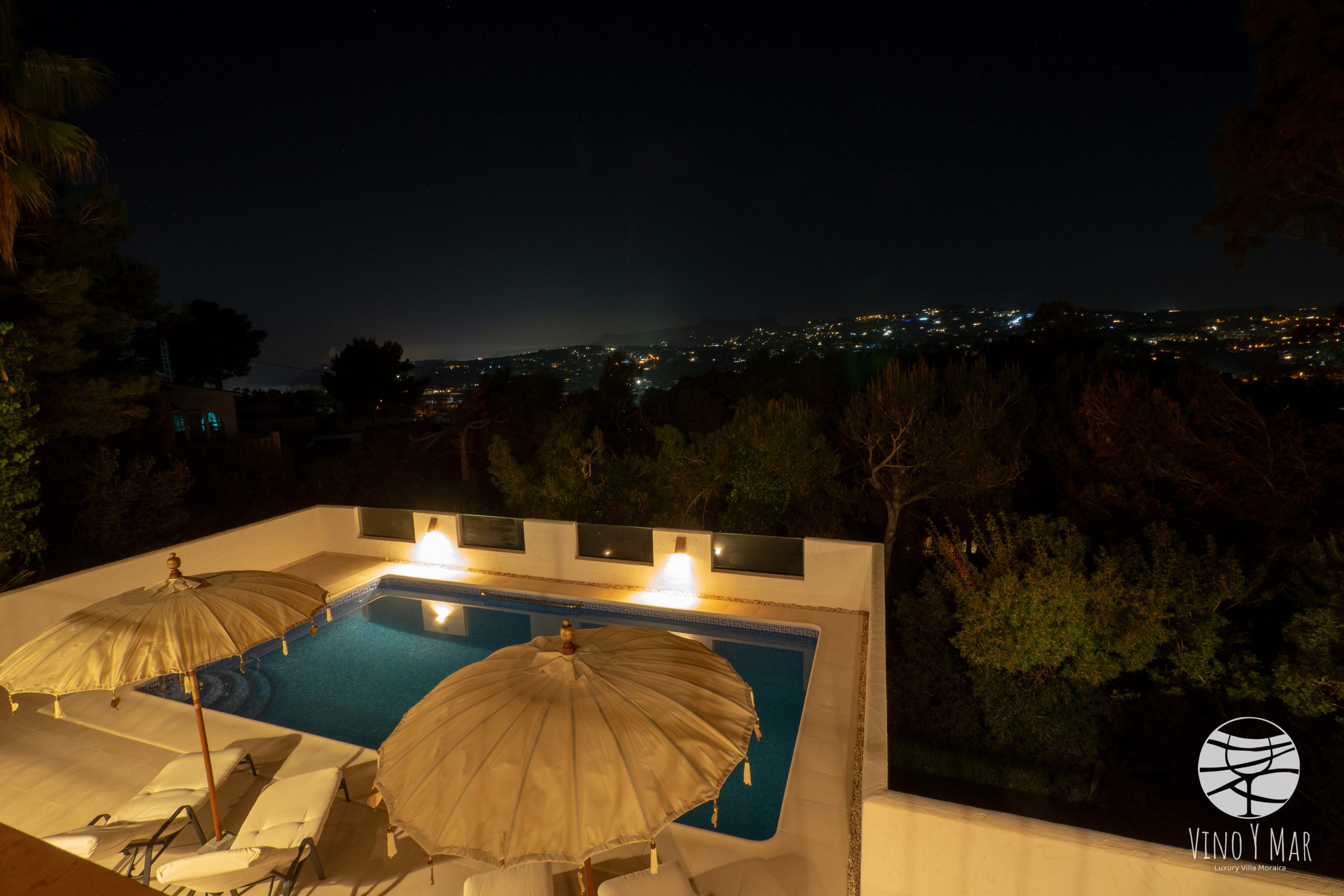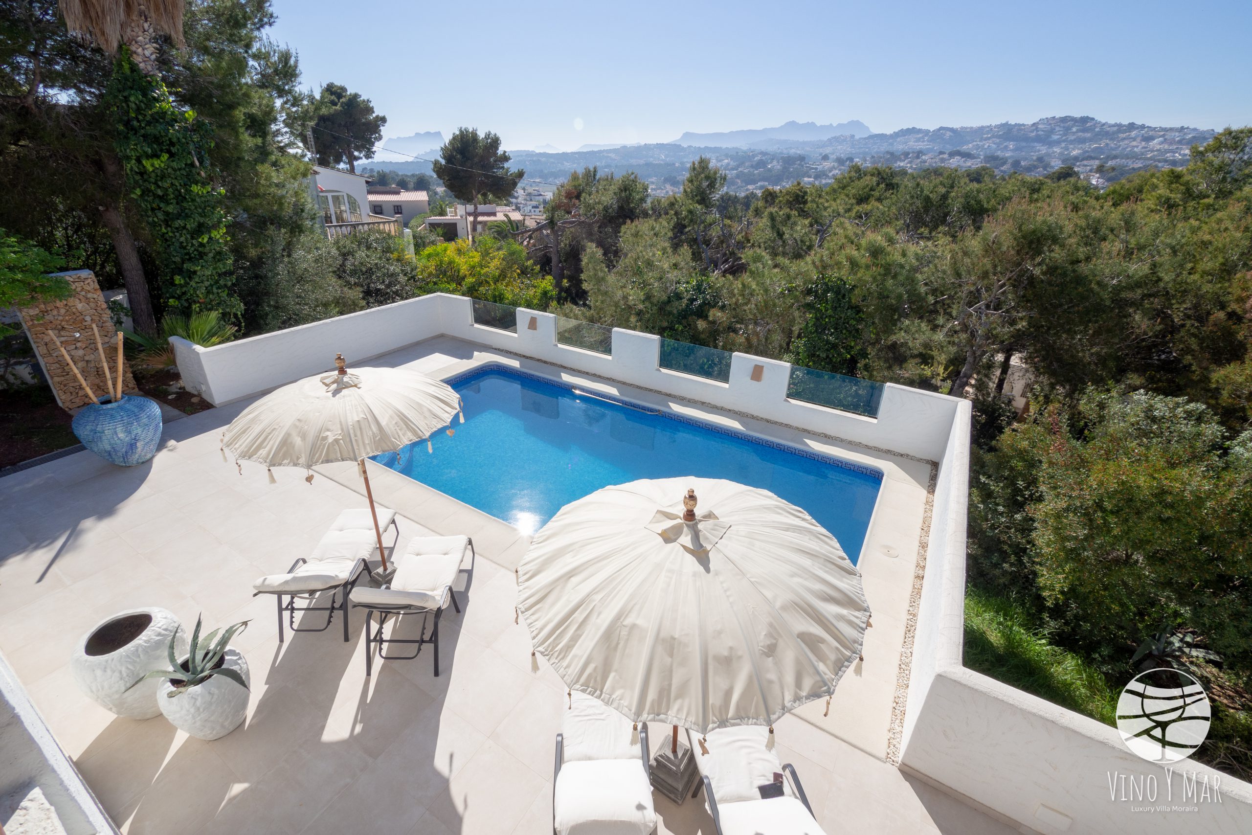 Villa Vino y Mar ligt op een heuvel in de zeer rustige wijk Paichi naast del Portret. Het perceel is te bereiken middels een oprijlaan en is ingesloten in een groene omgeving van sparren en palmbomen waardoor uw privacy is gewaarborgd. De terrassen van de villa en het zwembad zijn gelegen op het zuidwesten met een fantastisch uitzicht op zee en de vallei van Moraira.