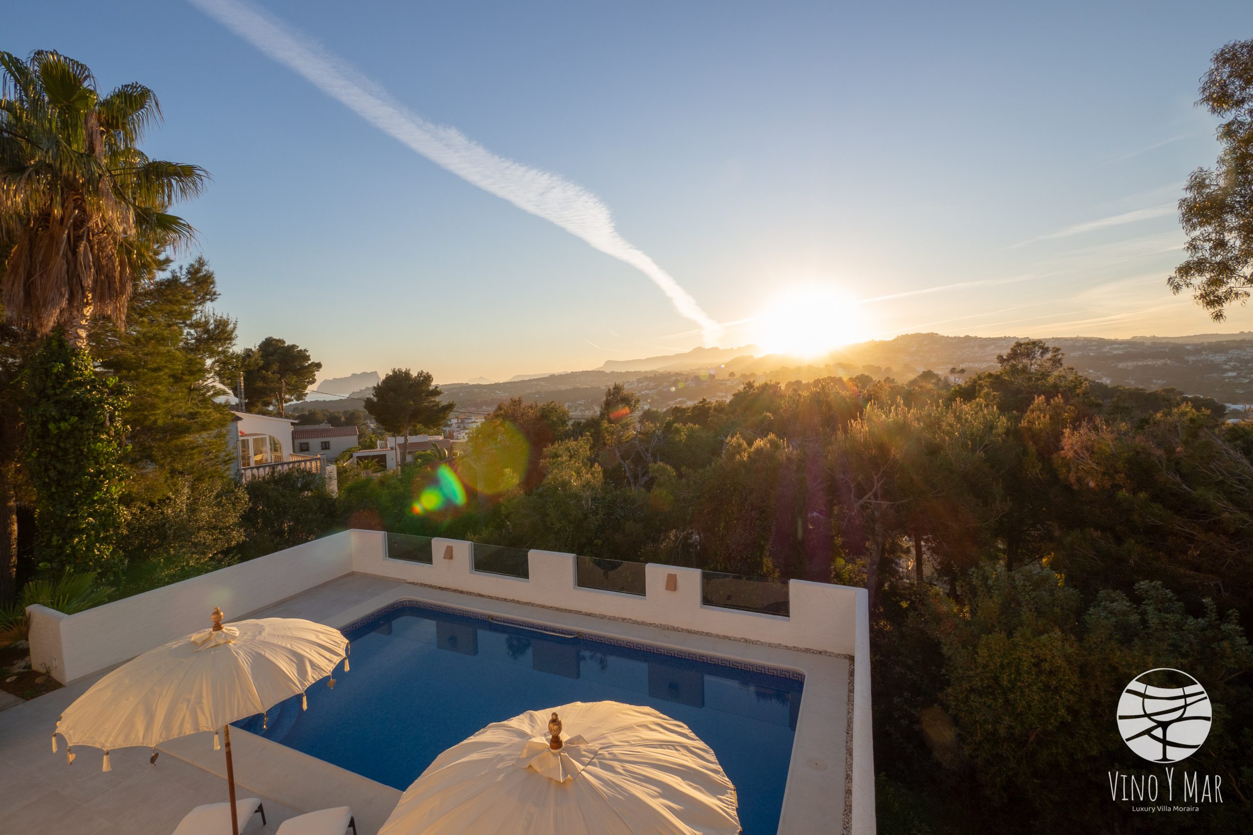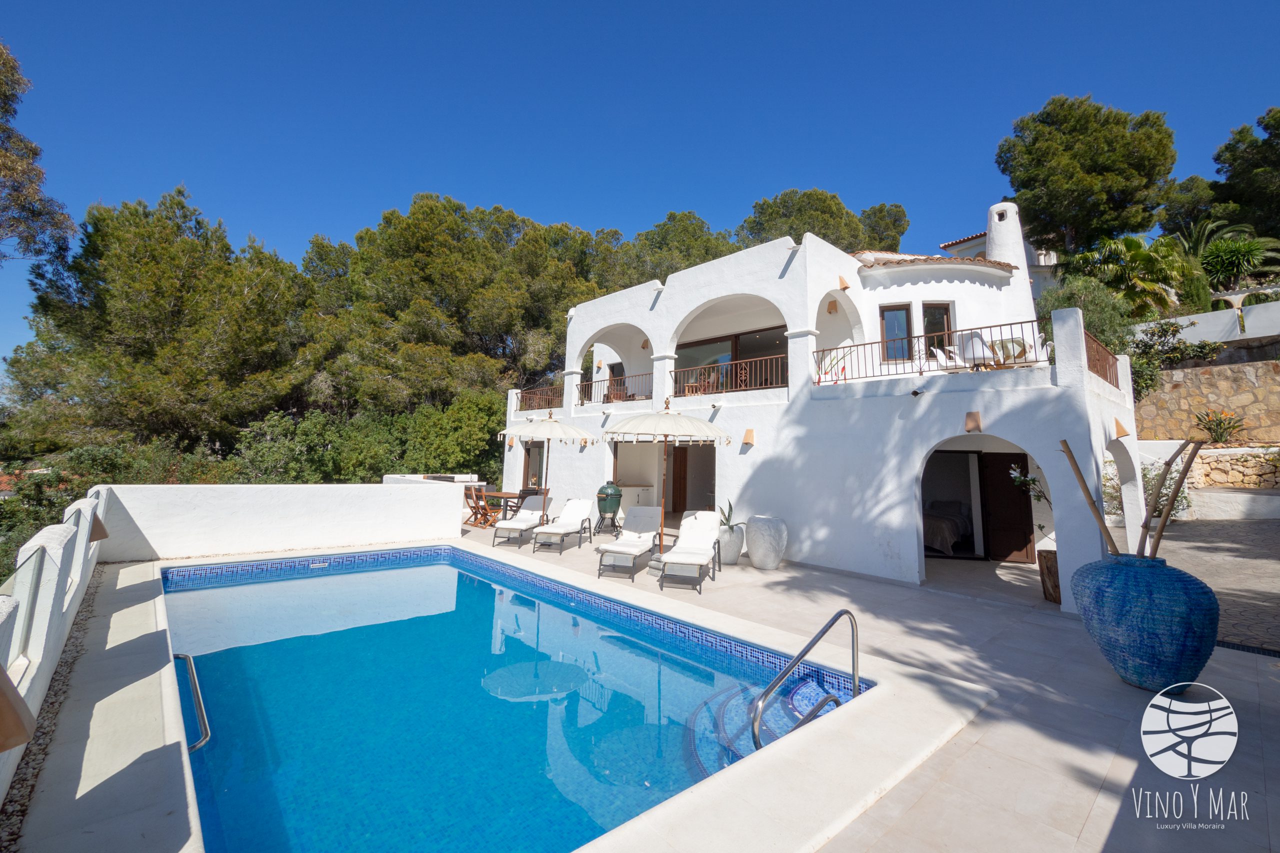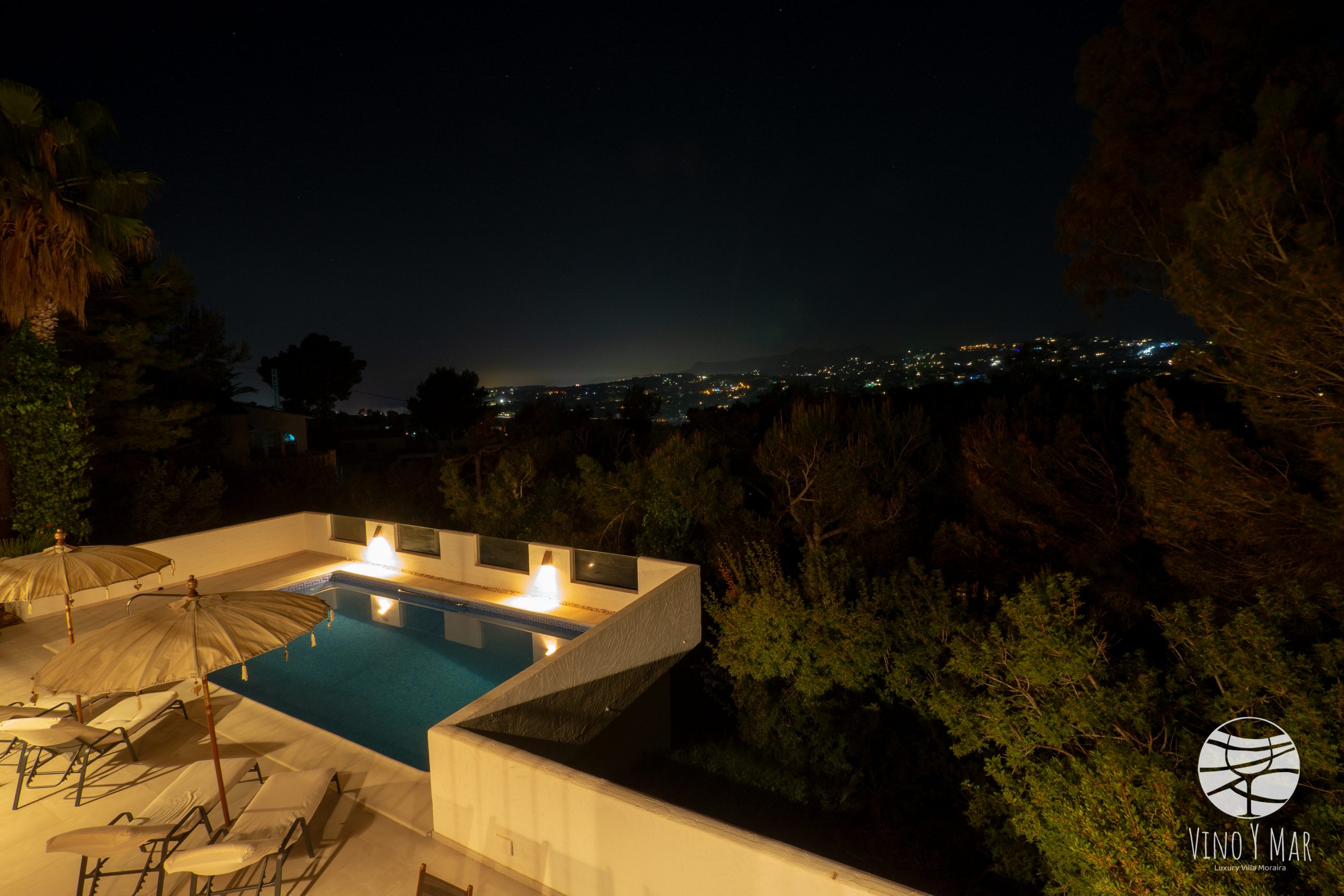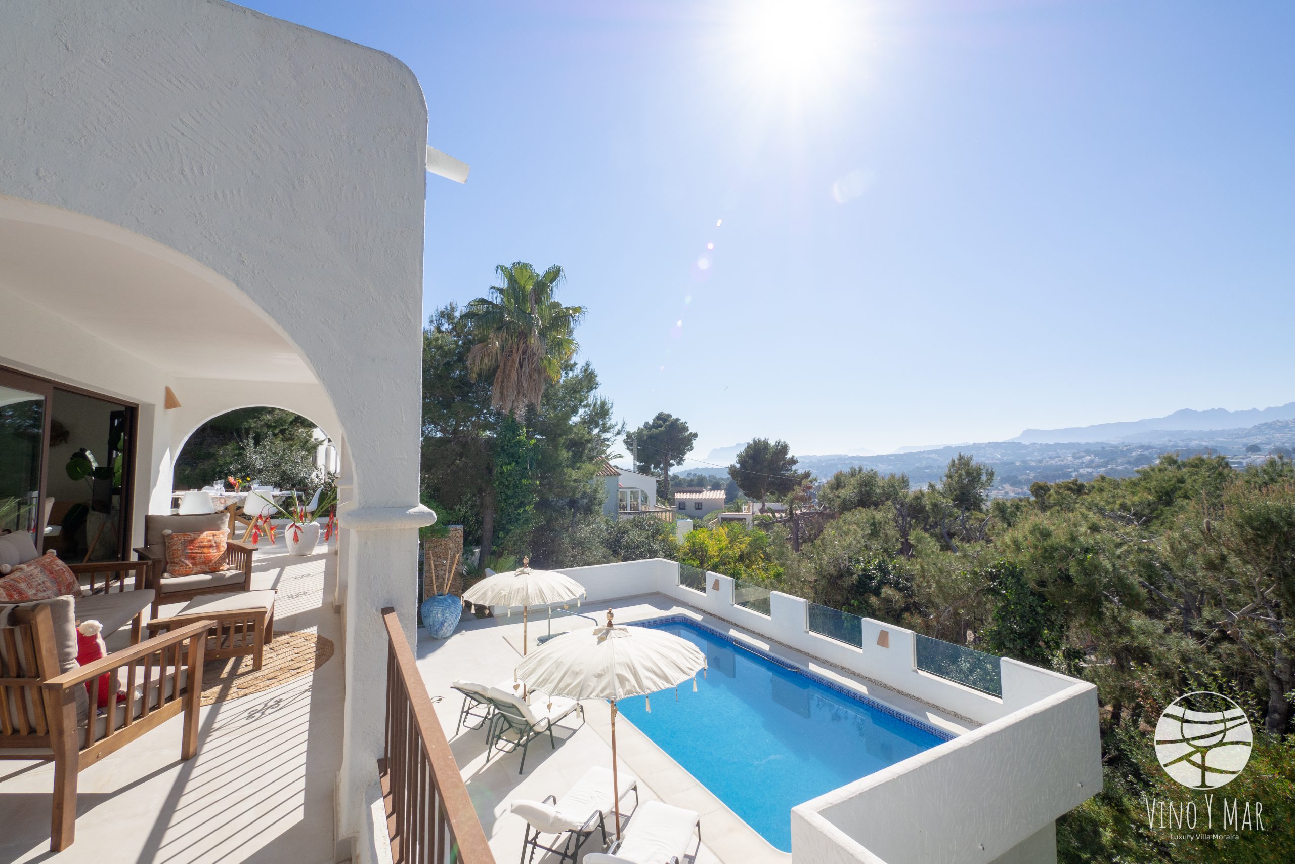 Villa Vino y Mar ligt op een heuvel in de zeer rustige wijk Paichi naast del Portret. Het perceel is te bereiken middels een oprijlaan en is ingesloten in een groene omgeving van sparren en palmbomen waardoor uw privacy is gewaarborgd. De terrassen van de villa en het zwembad zijn gelegen op het zuidwesten met een fantastisch uitzicht op zee en de vallei van Moraira.