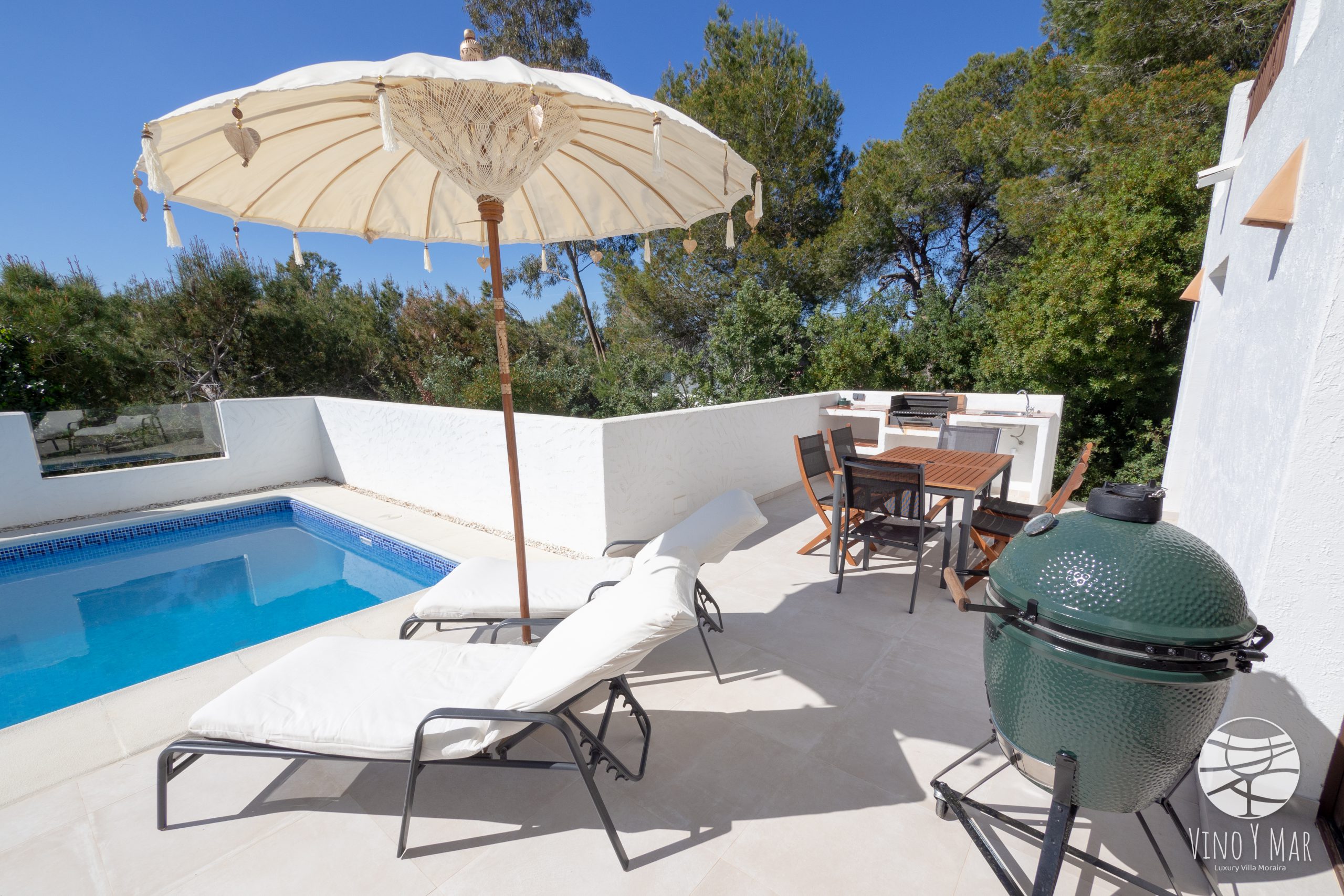Naast het stijlvolle buitenterras met zijn keramische potten, Ibiza-stijl parasols en voldoende terrasmeubels, is het zwembad gesitueerd. Heerlijk genieten van het frisse water in het royale zwembad met zonligging aan de voorzijde van de villa. Het zwembad is 8x4m groot en heeft een trap met een beugel waarmee u gemakkelijk in en uit kunt stappen. De reiniging van het zwembad vindt twee keer per week plaats. Voor- en na het zwemmen kunt u gebruik maken van de buitendouche naast het zwembad. ’s Avonds is het zwembad prachtig verlicht en wat een uniek totaalplaatje geeft.